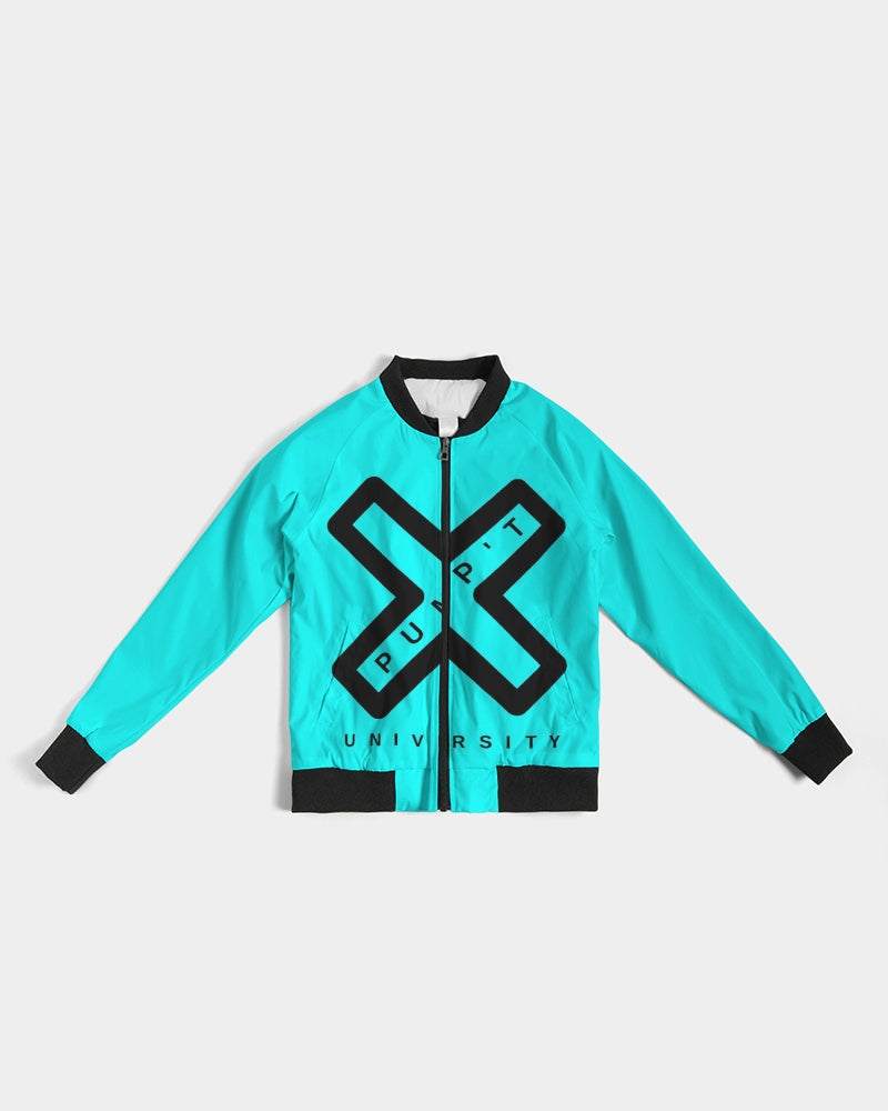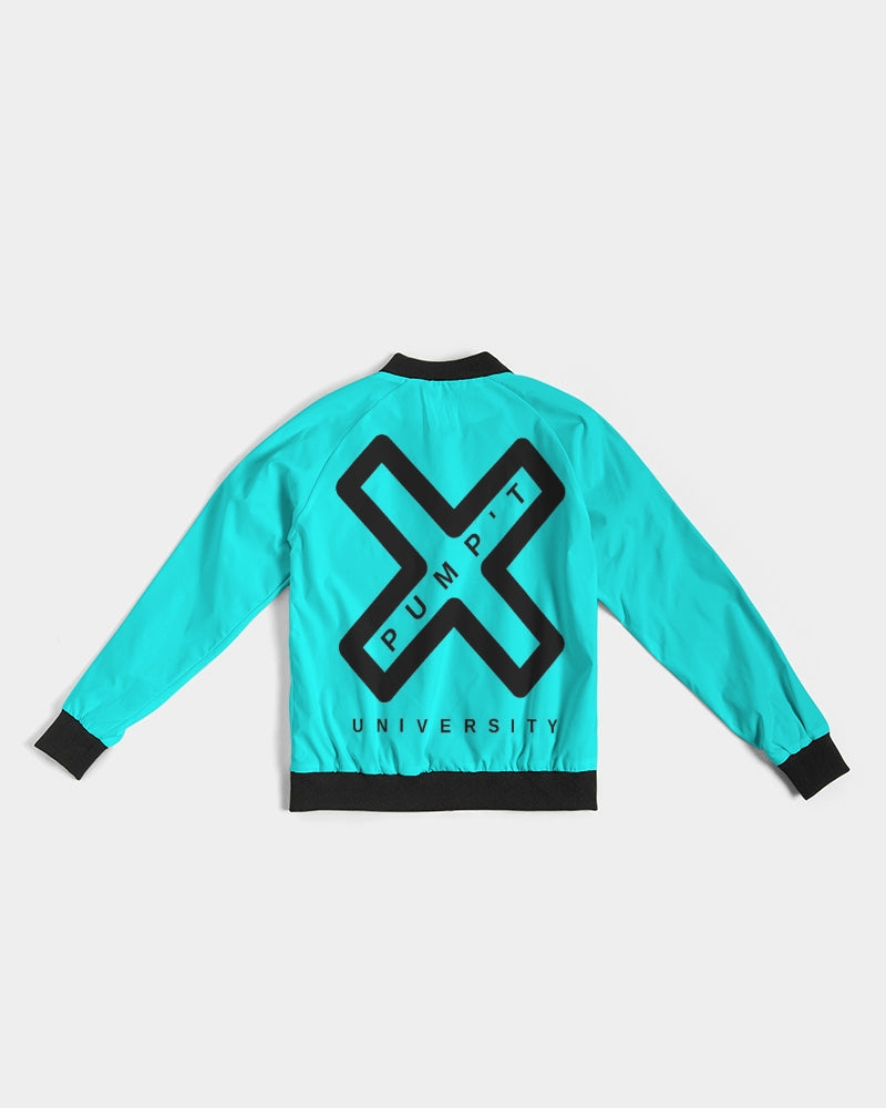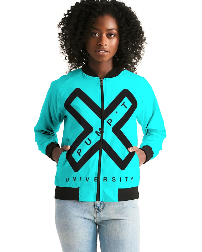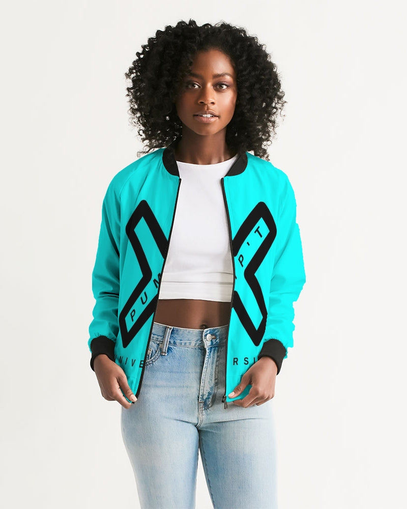 About The ArtPUMP'T UNIVERSITY LOGO 'X' THE PUMP'T LOGO'S 'X' REPRESENTS CROSSTRAINING BETWEEN THE TWO WORLDS OF DANCE AND PHYSICAL EXERCISE, EXPLORING SENSUALITY, AND TRANSFORMATION BETWEEN THE OLD YOU AND THE NEW PROGRESSED YOU. 'X' OUT ALL YOUR INHIBITIONS AND #GETPUMPT FOR A NEWER, FITTER, SEXIER, MORE CONFIDENT ( & MOST OF ALL) HEALTHY YOU! Product DetailsHand-cut and crafted with care, your custom designed Women's Bomber Jacket will set off any look! Its lightweight, airy fabric is lined with the perfect amount of insulation for the chillier months making this a great year round go-to.